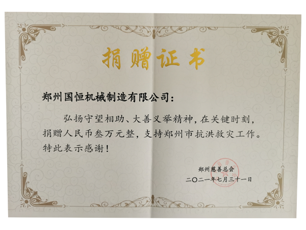 一場(chǎng)千年一遇的大雨,造成整個(gè)城市排水系統(tǒng)癱瘓,因暴雨導(dǎo)致的洪水,造成多地受災(zāi)嚴(yán)重,有人甚至因此失去了生命,為了支援災(zāi)后重建,鄭州國恒機(jī)械設(shè)備制造有限公司,捐款叁萬元整,支持鄭州市抗洪救災(zāi)工作,愿我們守望相助,共渡難關(guān)。